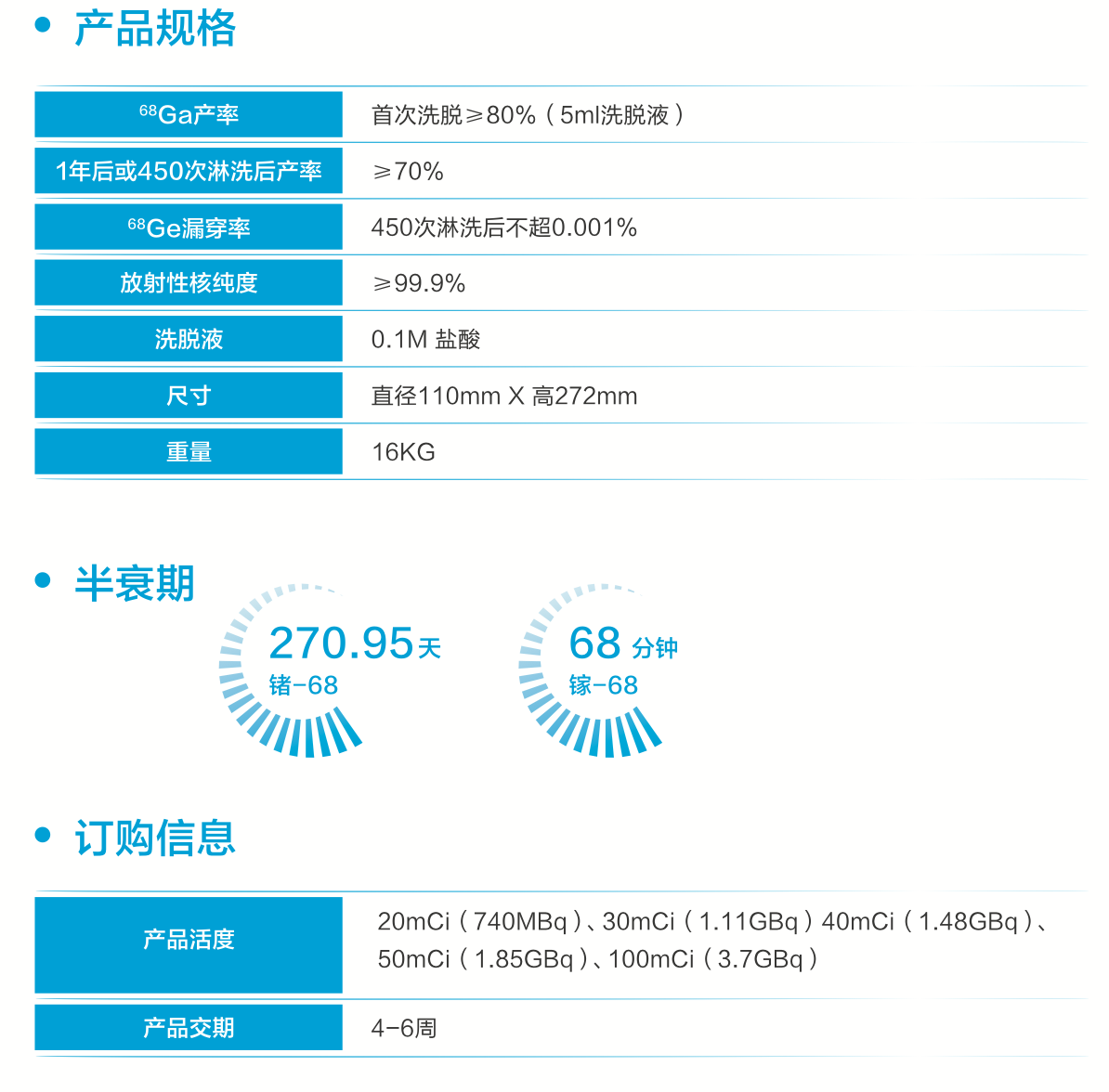 锗镓发生器是一种在核医学用于制备正电子发射核素镓-68的装置。中广核锗镓发生器采用改性二氧化钛作为锗-68吸附剂,内置溶液传输管道。随着放射性母核素--锗-68的衰变可连续产生镓-68,在使用时由0.1M盐酸洗脱。本产品易于操作和维护,符合辐射安全准则,在需要时可以安全的获取镓-68溶液。